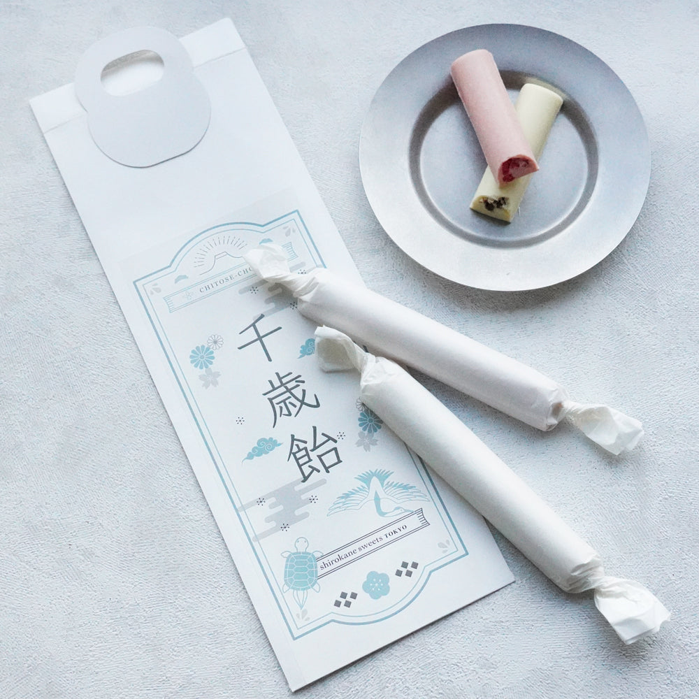 日本の伝統文化である七五三のお祝いとして定番の「千歳飴」を、洋菓子専門店ならではの手作りで紅白のホワイトチョコレートに落とし込み、子供たちが持ち歩いても可愛く、食べても美味しいオリジナルの千歳飴チョコレートを企画、制作に数年かかりましたが、ようやく形になりました。千歳飴は縁起の良いものだとされ、形状が細く長く、紅白のものが一般的で、「細く長く粘り強く、いつまでも健康で長生きしてほしい」という想いが込められているお菓子です。節目のお祝いである七五三にお子様の健やかな成長を親御様と共に祈りつつ、1つ1つ手作りで製作させて頂いております。