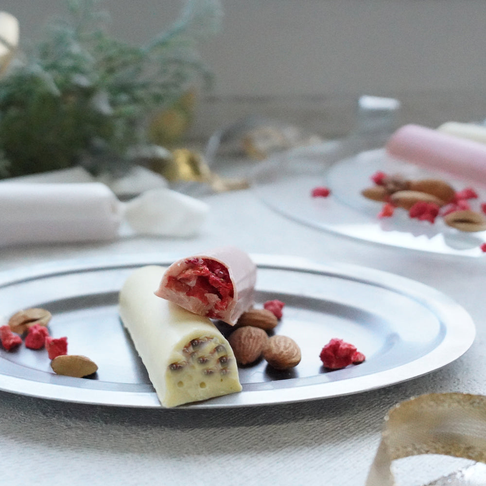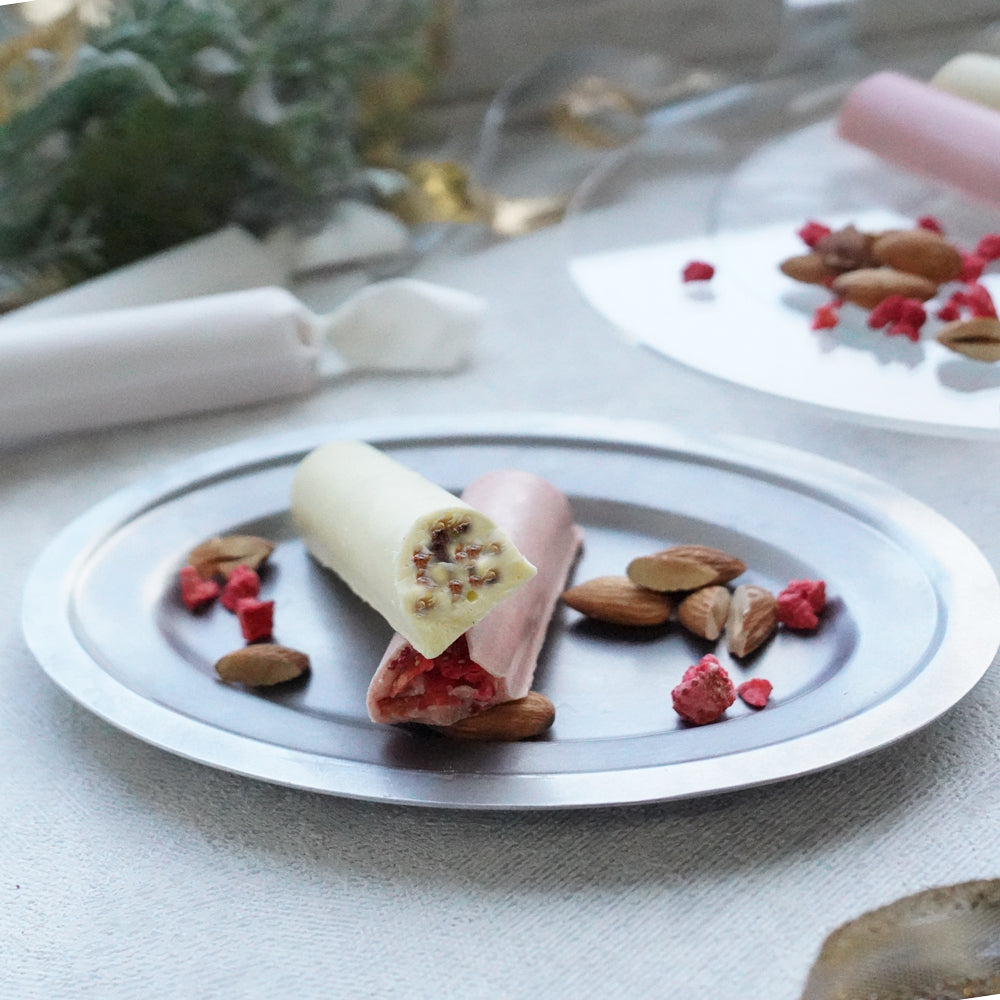 子供たちが大好きなイチゴチョコレートとホワイトチョコレートで紅白にし、更にホワイトチョコレートにはクッキークランチ、ナッツとカラメルクラッシュキャンディ、イチゴチョコレートにはフリーズドライのフランボワーズとイチゴの果肉とクラッシュしたストロベリーキャンディを入れお味も楽しめる2種で展開しています。